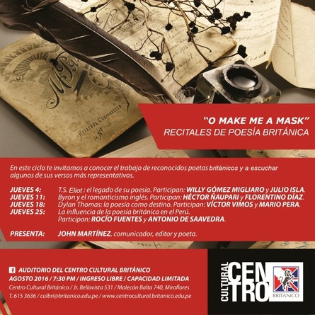 Como parte de su labor por difundir la poesía, el centro cultural Británico viene organizando conversatorios sobre su literatura. Reconocidos poetas e intelectuales participan de estas conversaciones, en las que ...